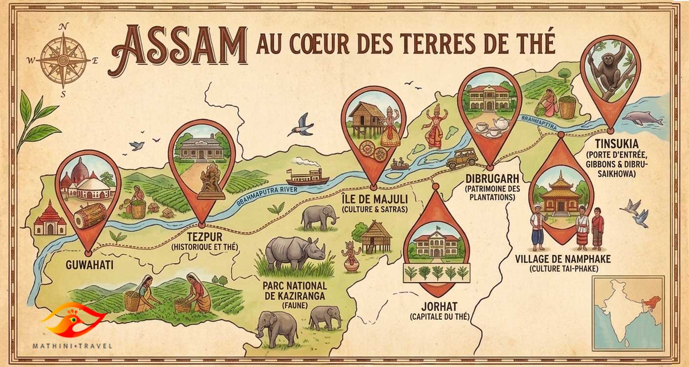 L’Assam, État du nord-est de l’Inde, est un des plus grands producteurs de thé au monde. Son économie et son paysage sont structurés depuis le XIXe siècle autour de vastes domaines agricoles qui ont conservé une infrastructure unique : les Tea Bungalows. Ces anciennes résidences de gestionnaires coloniaux britanniques, aujourd’hui restaurées pour l’hôtellerie, constituent le fil conducteur de cet itinéraire.
